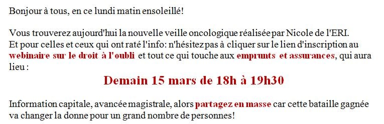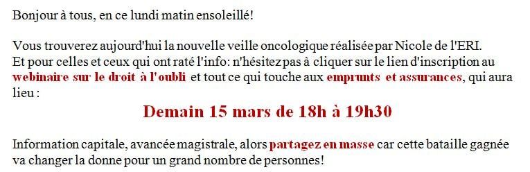 --> la conférence / table ronde sur les droits et les démarches des patients en cancérologie et surtout ce qui concerne les prêts, les assurances, le droit à l'oublie, l'emploi (maintien et retour, autres dispositifs existants...) avec des intervenants de grande qualité.