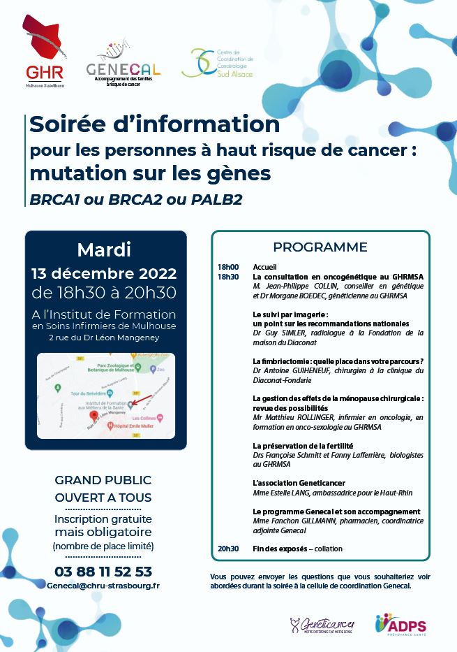 Le service de génétique du GHRMSA avec le Dr Ginglinger en sa qualité de chef de service, l'association @GENECAL, et le Centre de Coordination Cancer de Mulhouse vous proposent une soirée d'information pour les personnes à hauts risques de cancer.