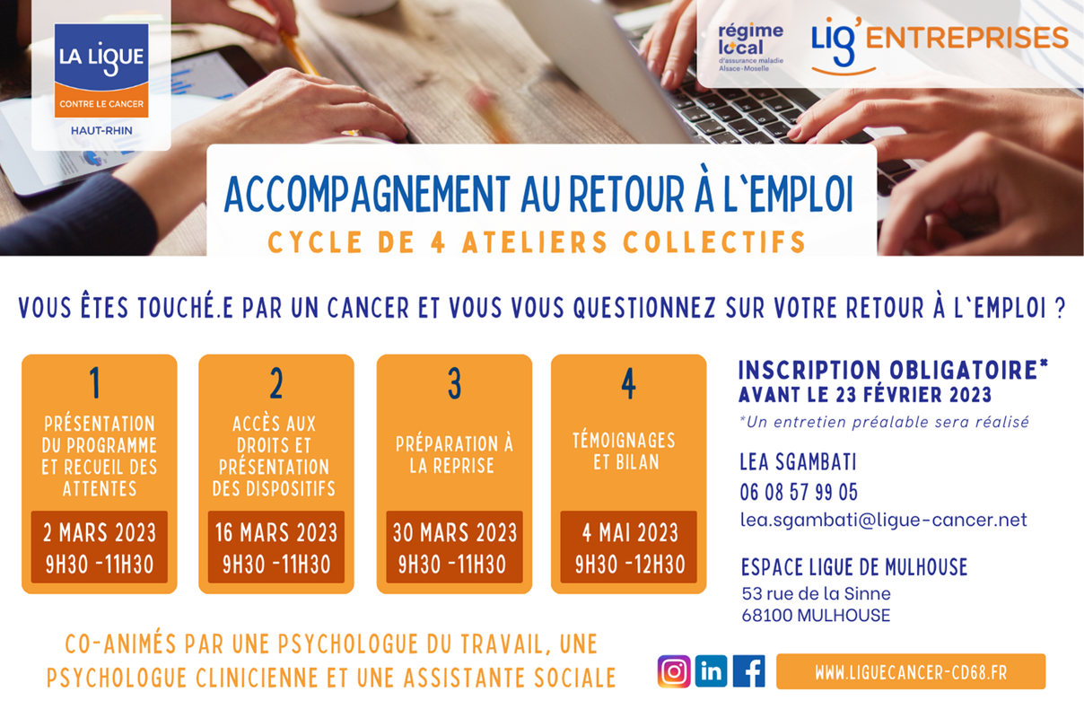 Cancer et retour à l'emploi: n'hésitez pas à contacter Léa Sgambati pour participer aux ateliers d'accompagnement, et réussir votre retour au travail, quels que soient vos envies, vos possibilités, vos difficultés...